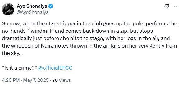 In a post shared on his X account, Ayo asked a question as it relates to spraying str!ppers at str!p clubs.