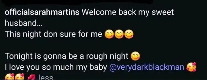 Her post reads, “Welcome back my sweet husband. This night don sure for me 🥰🥰. Tonight is gonna be a rough night. I love you so much baby @verydarkblackman”.