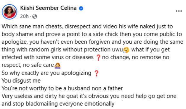 "Which sane man cheats, disrespect and video his wife n@ked just to body shame and prove a point to a side chick then you come public to apologize, you haven't even been forgiven and you are doing the same thing with random girls without protection uwu. What if you get infected with some virus or diseases? No change, no remorse no respect, no safe care. So why exactly are you apologizing? You disgust me. You're not worthy to be a husband nor a father. Very useless and dirty he goat it's obvious you need help go get one and stop blackmailing everyone emotionally," she wrote.