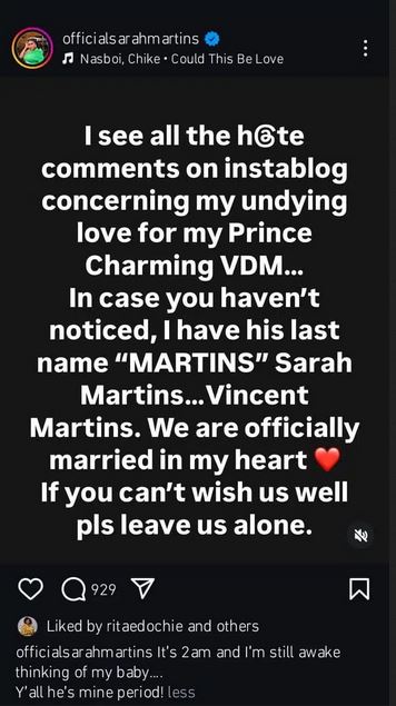 In case you haven’t noticed, I have his last name “Martins”, Sarah Martins… Vincent Martins. We are officially married in my heart. If you can’t wish us well, pls leave us alone.