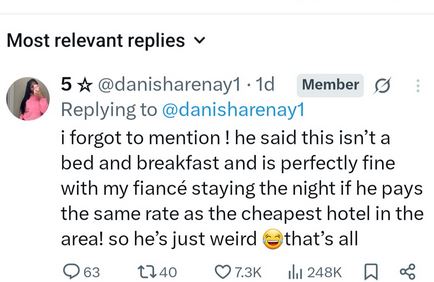 "I forgot to mention ! he said this isn’t a bed and breakfast and is perfectly fine with my fiancé staying the night if he pays the same rate as the cheapest hotel in the area! so he’s just weird that’s all."