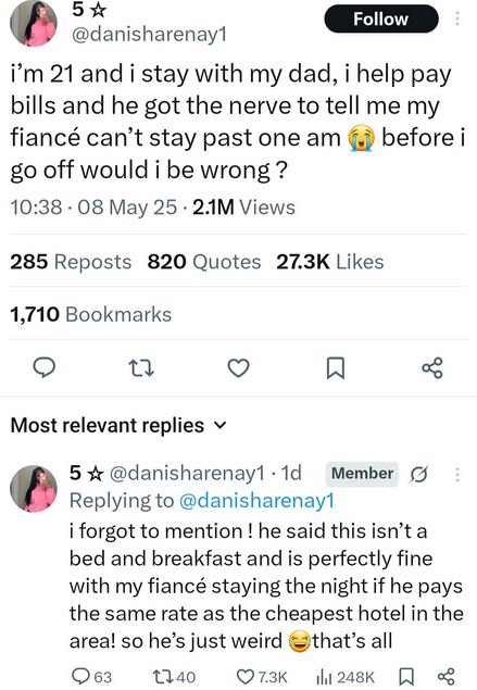 She wrote: "I’m 21 and i stay with my dad, i help pay bills and he got the nerve to tell me my fiancé can’t stay past one am before i go off would i be wrong?