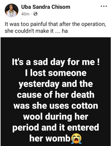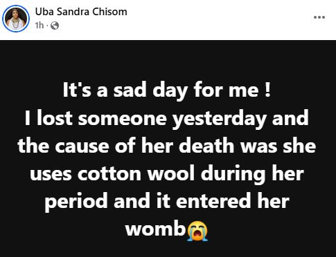 “It's a sad day for me ! I lost someone yesterday and the cause of her death was that she uses cotton wool during her period and it entered her womb,” she wrote.