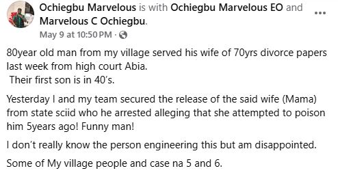 “80-year old man from my village served his wife of 70yrs divorce papers last week from high court Abia. Their first son is in 40’s,” he wrote.