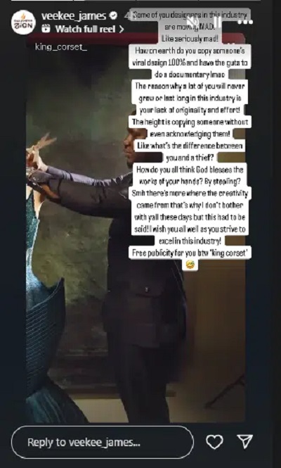 Fashion designer, Veekee James has slammed a Senegalese designer for copying her design without giving her credit.