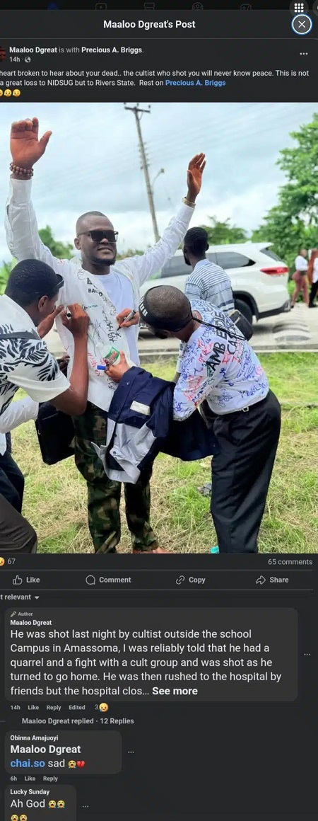 In his post, he wrote: “I am heartbroken to hear about your death. The cultists who shot you will never know peace. This is not just a great loss to NIDSUG but to Rivers State. Rest on, Precious A. Briggs.”