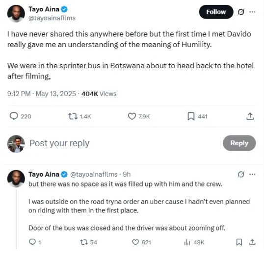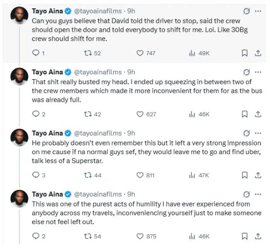 Popular travel blogger, Tayo Aina has revealed how Davido showed him an act of kindness.