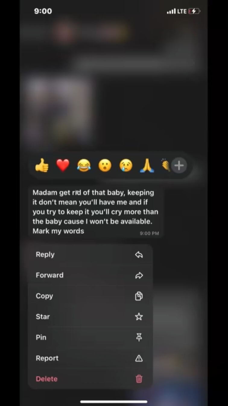 In it, the man is seen telling her to terminate the pregnancy, otherwise she would ''cry more than the baby' because he has no plans to step up as the father.