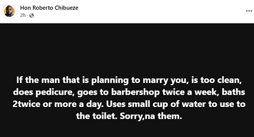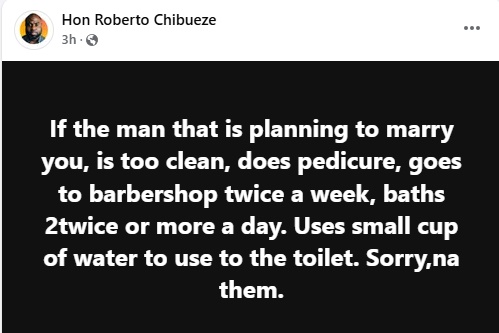 In a Facebook post, he warned that a man being too clean, does pedicure, bathes twice or more daily, is a red flag.