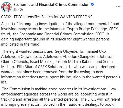 As part of its ongoing investigations of the alleged monumental fraud involving many actors in the infamous Crypto Bridge Exchange, CBEX, fraud, the Economic and Financial Crimes Commission, EFCC, is gaining important ground in its search for eight wanted persons implicated in the fraud.