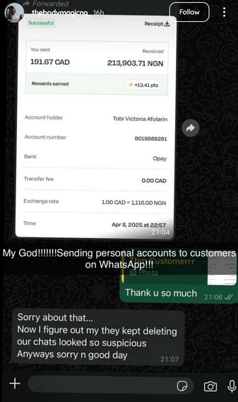 Screenshots also revealed WhatsApp conversations between the staff and unsuspecting clients, showing proof of payment receipts sent to personal accounts.