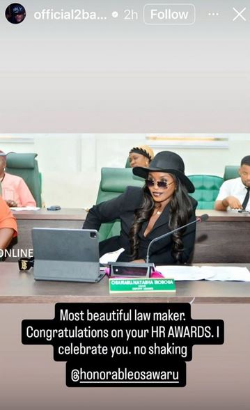 Sharing a picture of Honourable Natasha via his Instastory, the music star wrote, “[The] most beautiful lawmaker. Congratulations on your HR award.