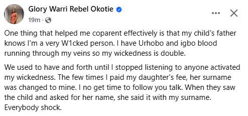 “One thing that helped me co-parent effectively is that my child's father knows I'm a very W1cked person. I have Urhobo and Igbo blood running through my veins so my wickedness is double,” she wrote.
