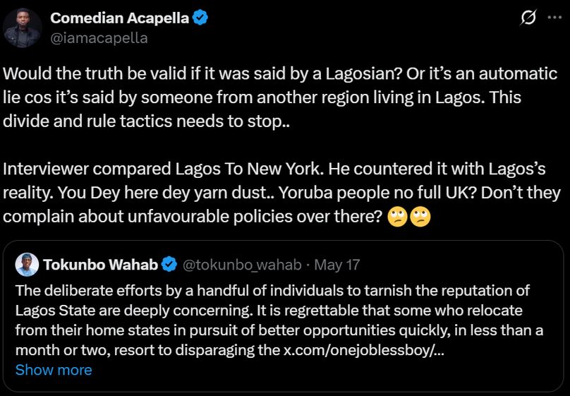 “Would the truth be valid if it was said by a Lagosian? Or it’s an automatic lie cos it’s said by someone from another region living in Lagos. This divide and rule tactics needs to stop,” the comedian wrote.