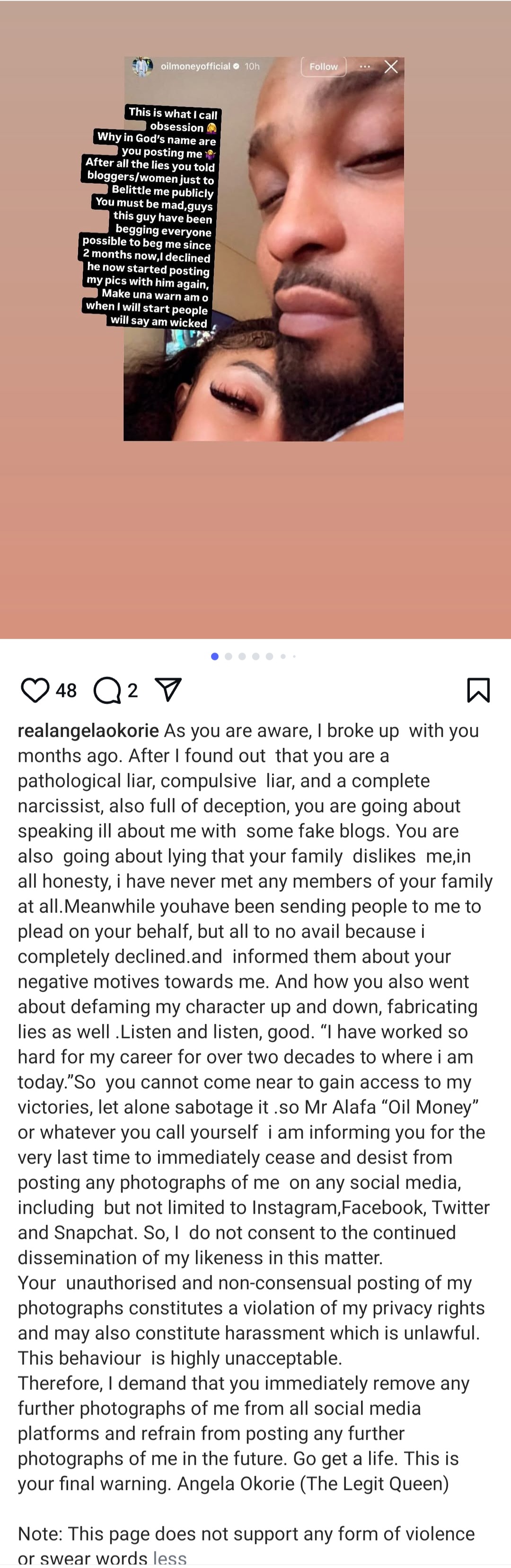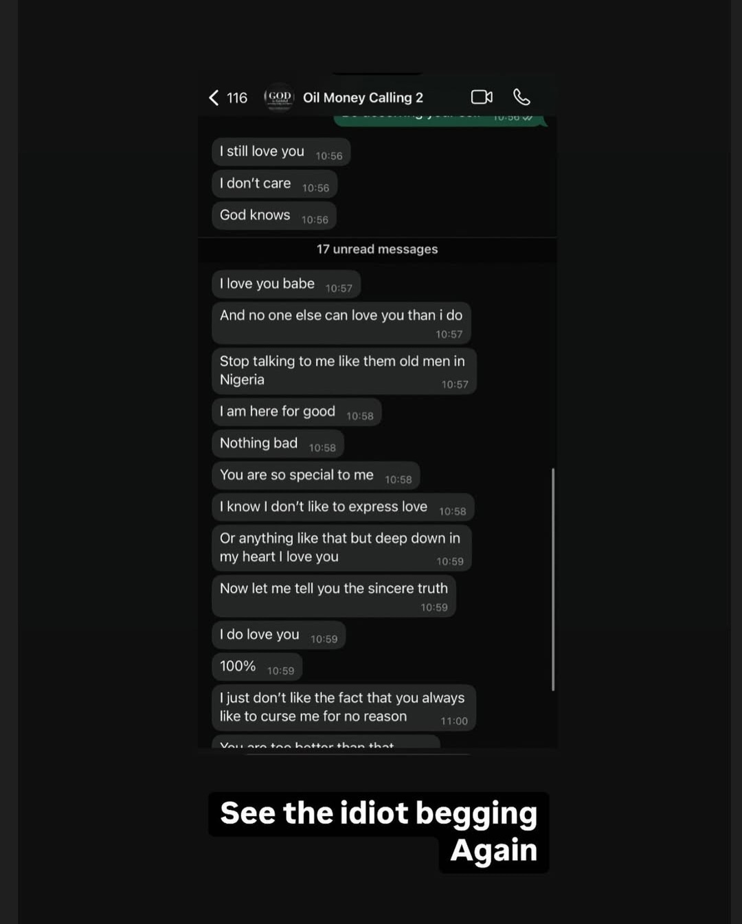 Angela Okorie has shared some alleged chat messages from her ex-boyfriend, in which he pleaded for a chance to return to her life.