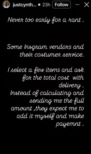 Cynthia narrated how she selected a few items from a vendor and asked for the total cost, including delivery — only for the vendor to send item prices individually and expect her to do the maths herself.