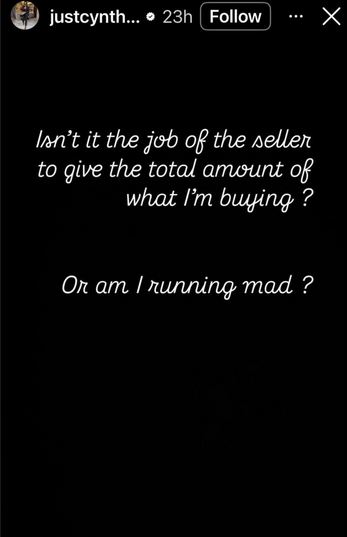 “Isn’t it the job of the seller to give the total amount of what I’m buying? Or am I running mad?” she asked, clearly frustrated.