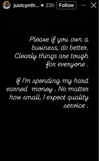 Fashion entrepreneur Cynthia Obi Uchendu has voiced her frustration over poor business practices, emphasizing that she won't tolerate subpar service when spending her hard-earned money.