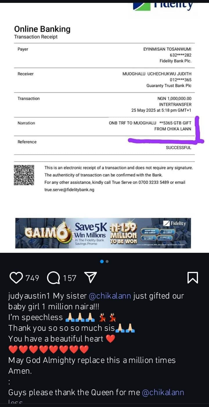 “My sister @chikalann just gifted our baby girl 1 million naira!!!
