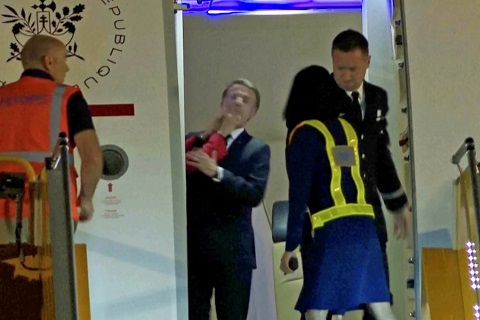 The video showed Macron appearing inside the door of his aircraft shortly after touching down in the northern Vietnamese city late on Sunday. A hand and arm, with the person not fully visible but dressed in red could then be seen appearing to shove the president's face from his right-hand side.