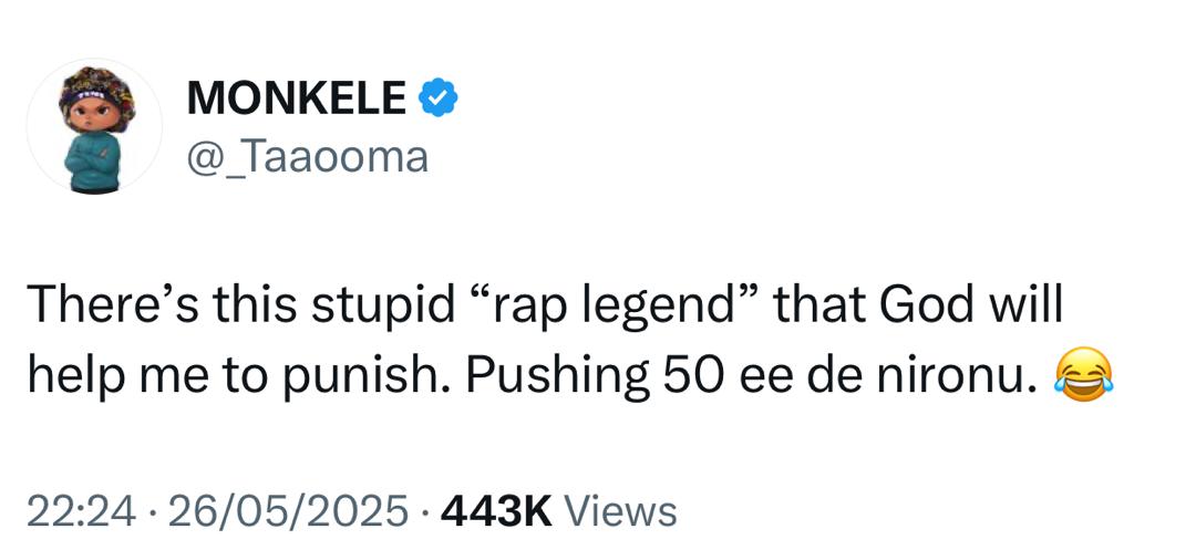 In the tweet, she wrote: “There’s this stupid ‘rap legend’ that God will help me to punish. Pushing 50 ee de nironu.”