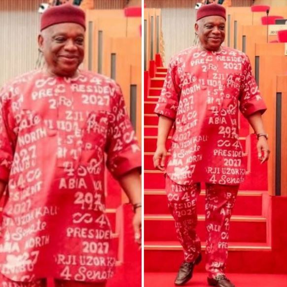 The Senator caused a stir online and in the upper chamber on Tuesday morning when he arrived rocking an African print with the text ‘’President Tinubu for 2027'' on it.