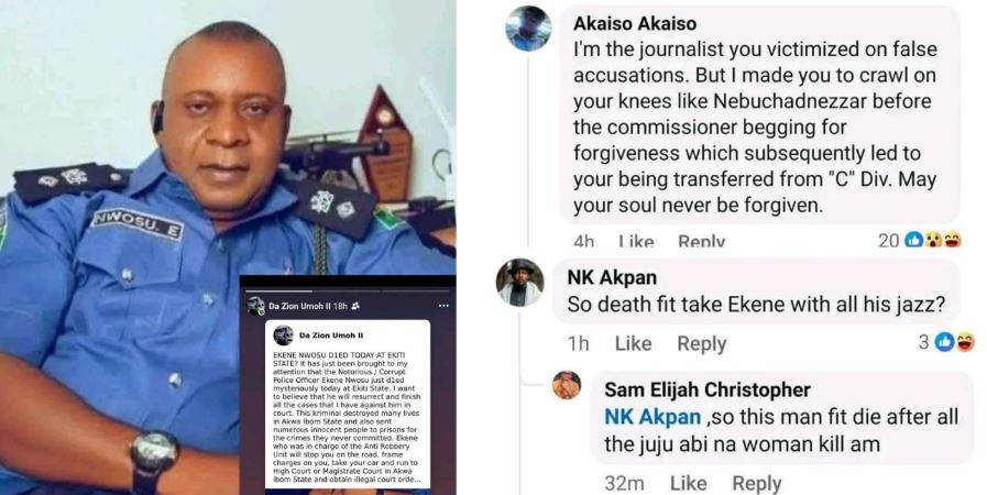According to Umoh, "It has just been brought to my attention that the Notorious / Corrupt Police Officer Ekene Nwosu just died mysteriously today at Ekiti State.