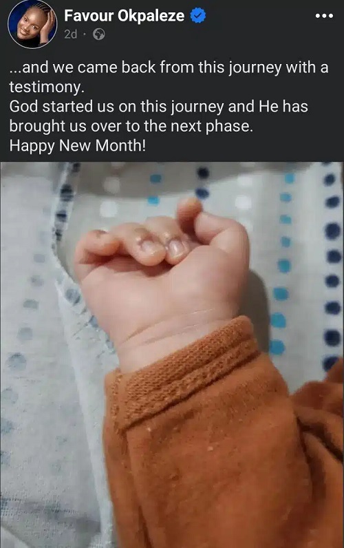 The singer took to the platform to share a picture of her newborn’s hand while expressing thanks to God.