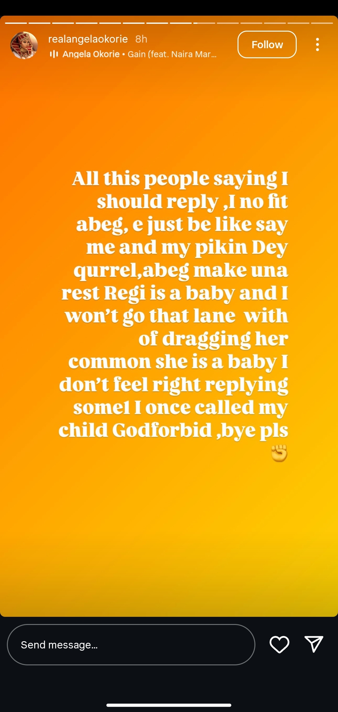“All this people saying I should reply, I no fit abeg, e just be like say me and my pikin Dey quarrel. Abeg make una rest. Regi is a baby and I won’t go that lane of dragging her. Common, she is a baby. I don’t feel right replying someone I once called my child. God forbid. Bye pls.”