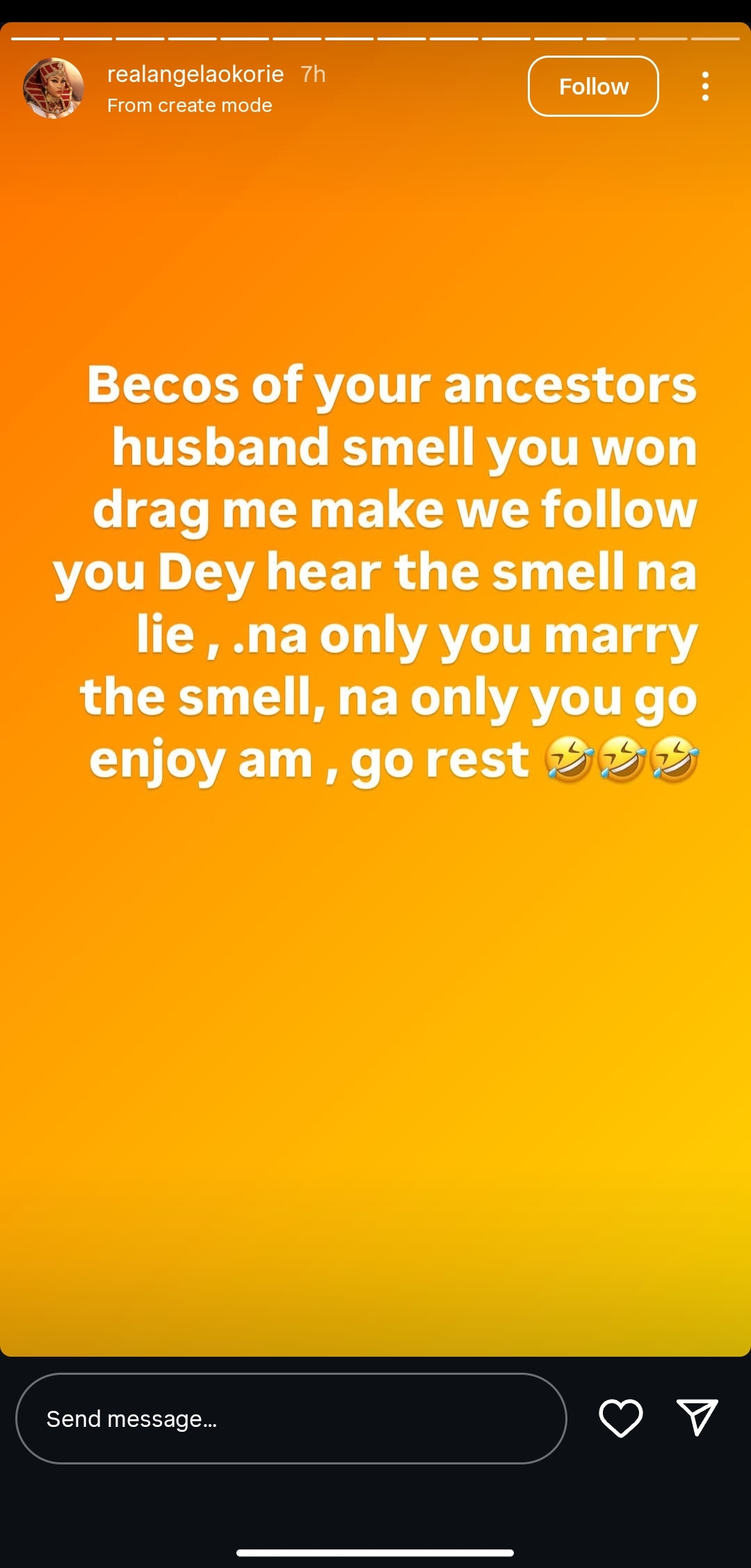 She then returned with another post, suggesting the entire drama was over Regina’s husband: “Becos of your ancestors husband smell you won drag me make we follow you Dey hear the smell. Na lie. Na only you marry the smell, na only you go enjoy am. Go rest 😂🤣🤣”