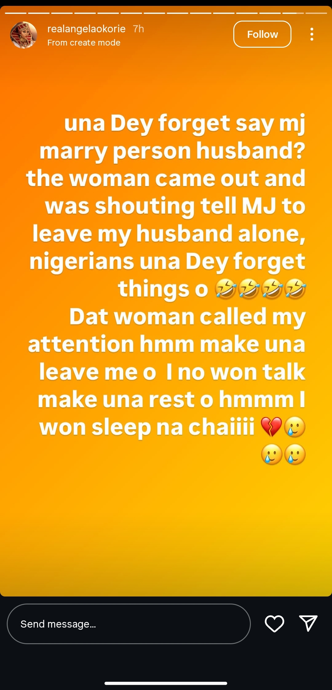 In a third post, she referenced a past allegation involving Mercy Johnson: “Una Dey forget say MJ marry person husband? The woman came out and was shouting ‘tell MJ to leave my husband alone’, Nigerians una Dey forget things o 🤣🤣🤣🤣. Dat woman called my attention. Hmm make una leave me o, I no won talk. Make una rest o. Hmm I won sleep na. Chaiii 💔🥲🥲🥲”