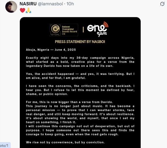 Popular skit maker, Nasboi has broken his silence after surviving an accident during his 36-state tour to get a music feature from Davido.