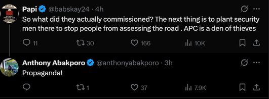 His commentary followed a viral post by another user, @babskay24, who questioned the authenticity of the commissioning, stating, “The next thing is to plant security men there to stop people from assessing the road. APC is a den of thieves.”