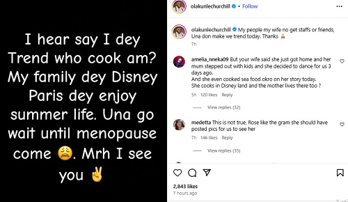 “I hear say I dey trend, who cook am. My family dey Disney Paris dey enjoy summer life. Una go wait until menopause come. Mrh I see you,” he posted.