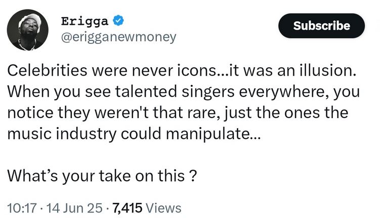 In a tweet that’s now making rounds across X (formerly Twitter), Erigga wrote: “Celebrities were never icons... it was an illusion.