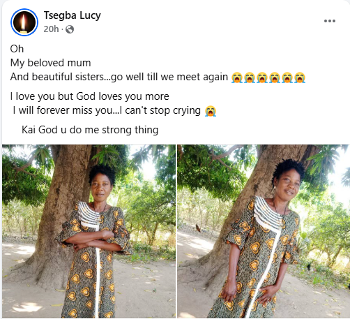 A Nigerian lady, Lucy Tsegba has taken to Facebook to mourn the k!lling of her mother and sisters by suspected herdsmen in the attack on Yelewata community, Guma Local Government Area of Benue State.