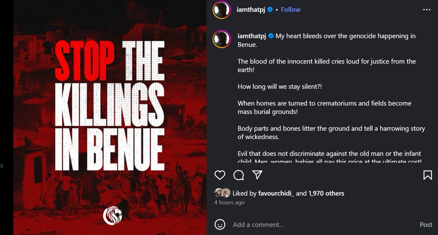 “My heart bleeds over the genocide happening in Benue. The blood of the innocent cries loud for justice from the earth!”
