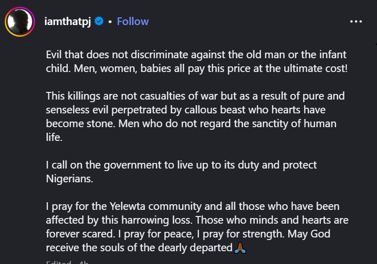 Odukoya’s post comes in the wake of national outrage sparked by the night attack that killed hundreds, including women and children. Social media has been flooded with reactions from celebrities like Mr Macaroni, 2Baba, and Tacha, all demanding justice.