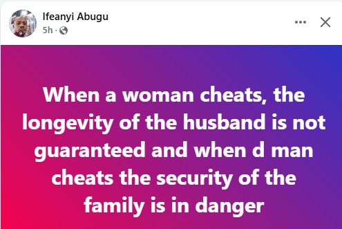 The man identified as Ifeanyi Abugu claimed that the longevity of a husband is not guaranteed when his wife cheats on him with other men.