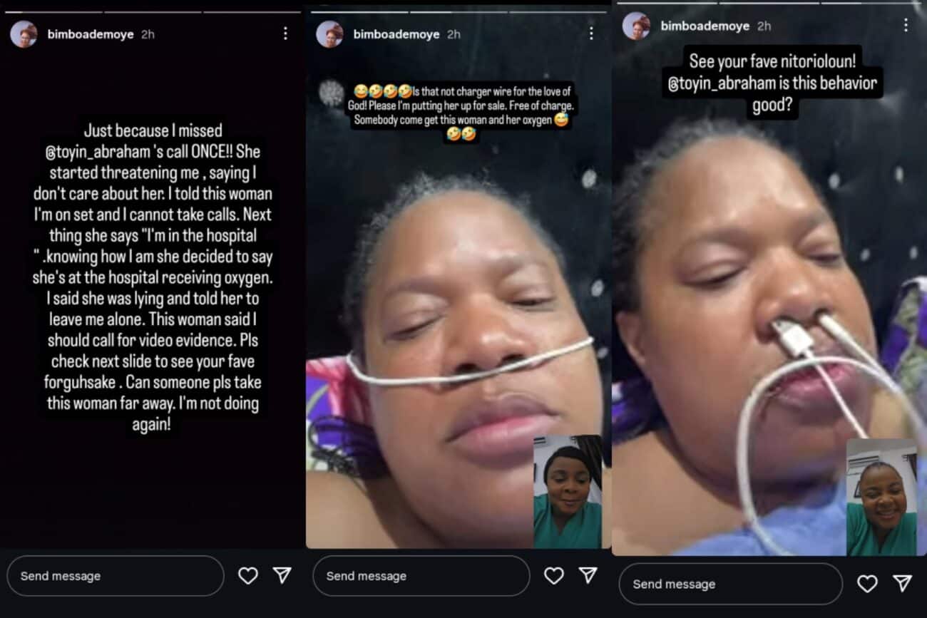 “Just because I missed @toyin_abraham’s calm ONCE!! She started threatening me, saying I don’t care about her. I told this woman I’m on set and cannot take calls. Next thing she says, “I’m in the hospital”. Knowing how I am, she decided to say she’s at the hospital receiving oxygen. I said she was lying and told her to leave me alone. This woman said I should call for video evidence.