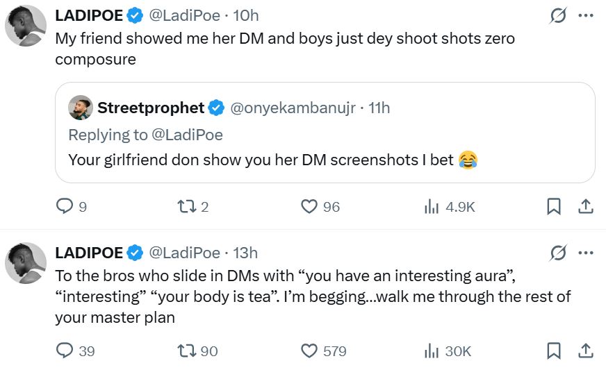 Ladipoe didn’t confirm or deny, but added: “My friend showed me her DM and boys just dey shoot shots zero composure.”