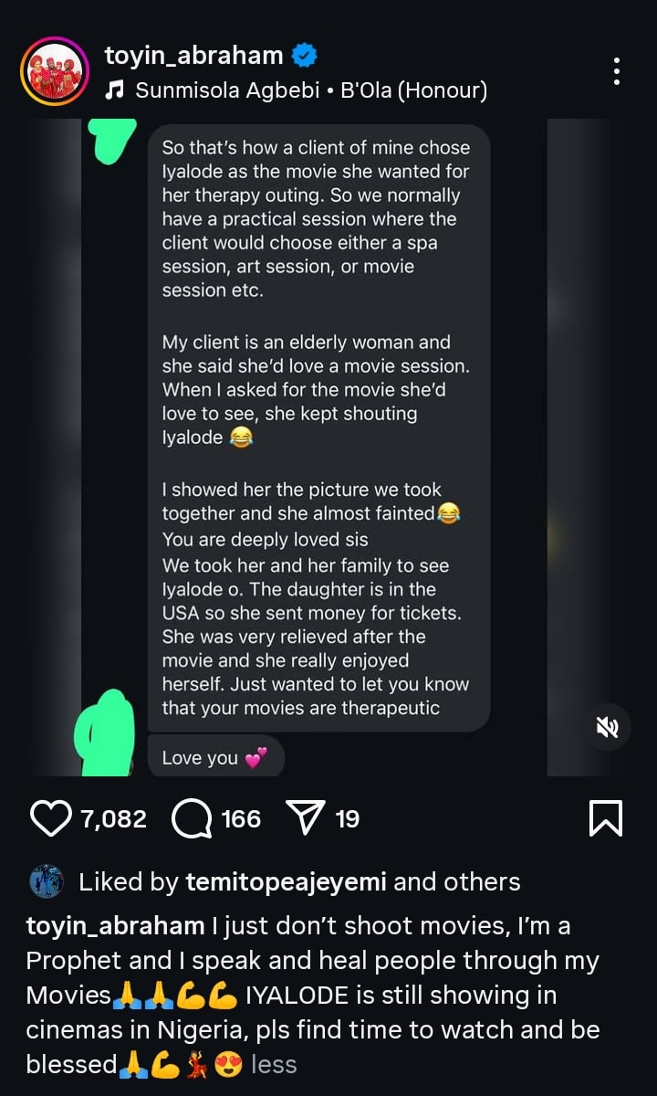 IYALODE is still showing in cinemas in Nigeria, pls find time to watch and be blessed”.
