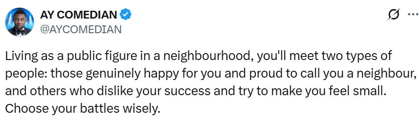 Nigerian comedian, AY Makun has offered thoughtful advice to public figures on managing daily life, particularly in their interactions with neighbors.