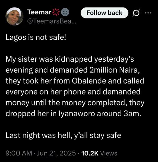 In a post shared on X (formerly Twitter), the user identified as @TeemarsBeauty revealed that her sister was abducted from Obalende by unknown individuals who later demanded a ransom of ₦2 million.