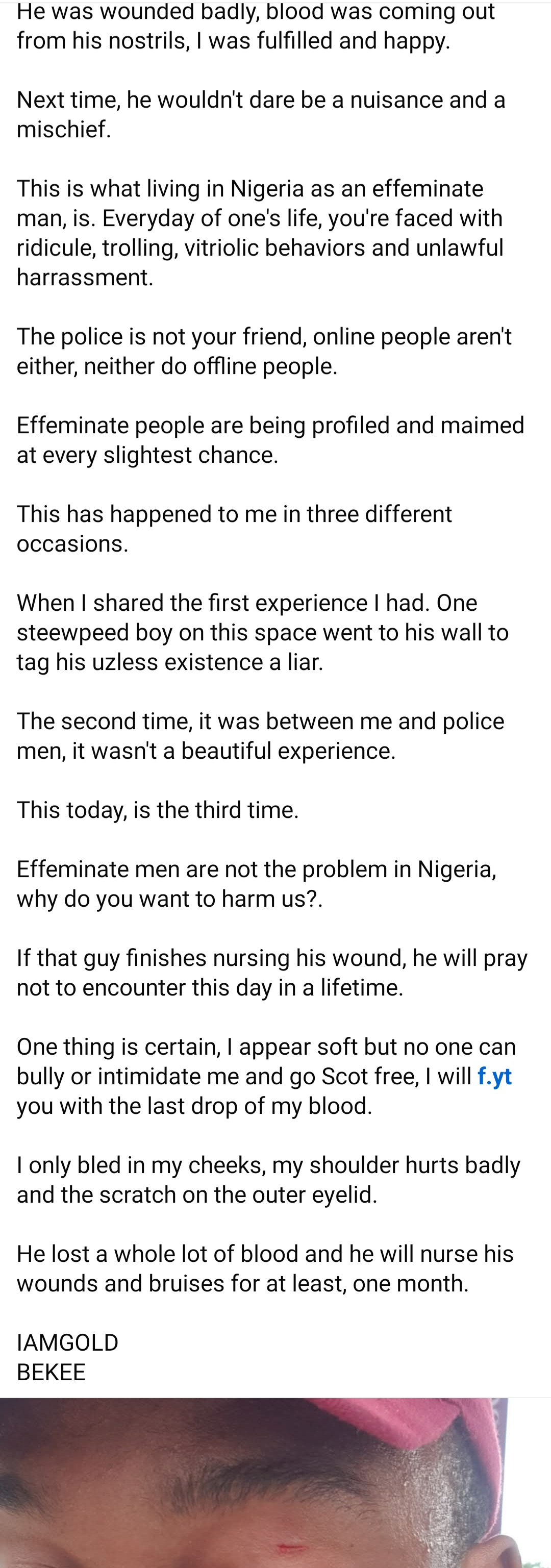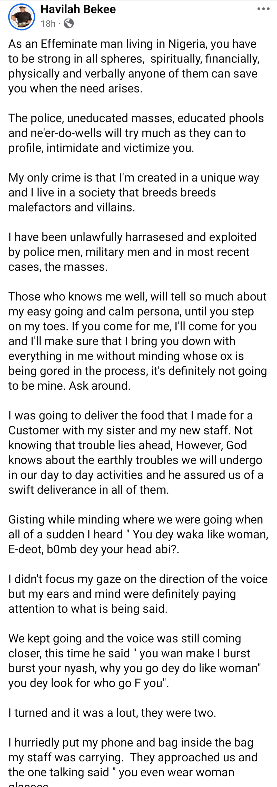 Havilah Bekee, an effeminate Nigerian chef, recently recounted an incident in Lagos State where he successfully fended off an attack by two assailants.
