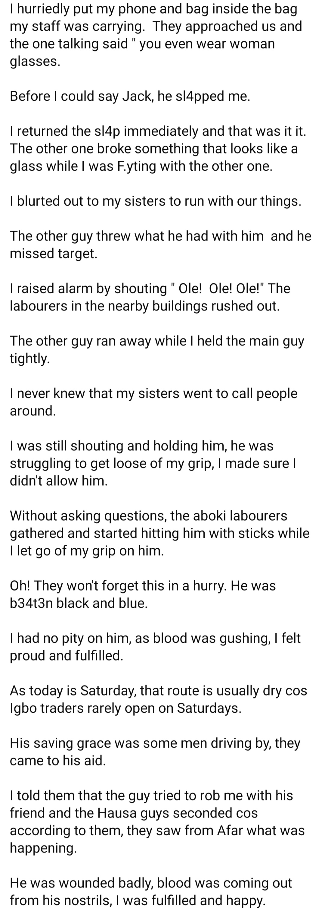 Realising the danger, Havilah told his sister and colleague to run away while he confronted the attackers. He began shouting "ole, ole" (which means "thief" in Yoruba), drawing the attention of nearby bystanders who rallied to help him.