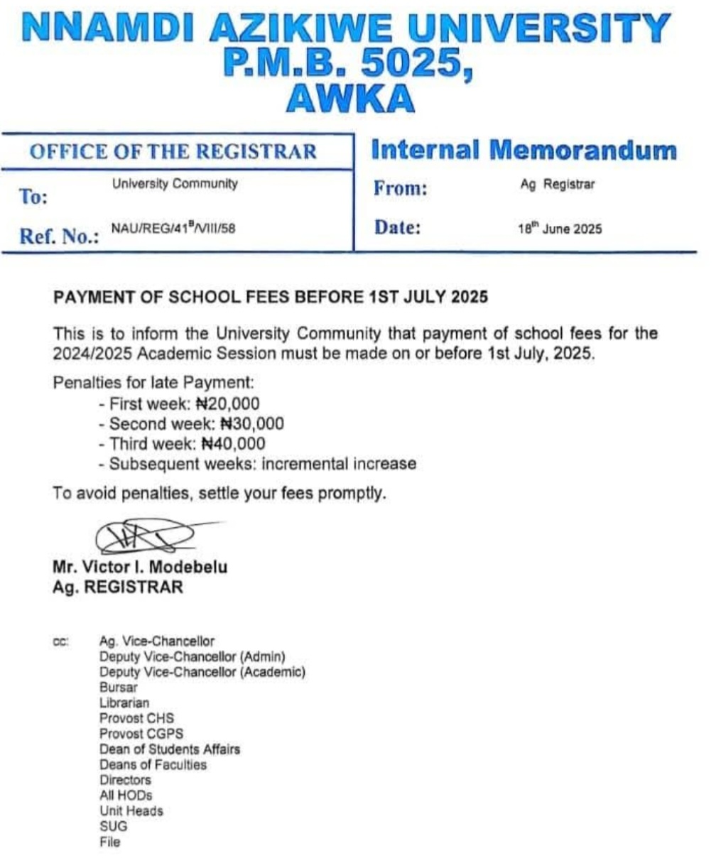 Nnamdi Azikiwe University (Unizik) has introduced penalties for students who fail to pay their tuition fees by July 1, 2025.