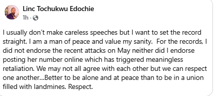 He stated that he is a man of peace and does not support the attacks on May or the act of sharing her number online.