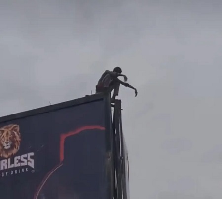 A man has been spotted hanging on top a tall billboard at Gadar Lado area in Zaria road, Kano state.