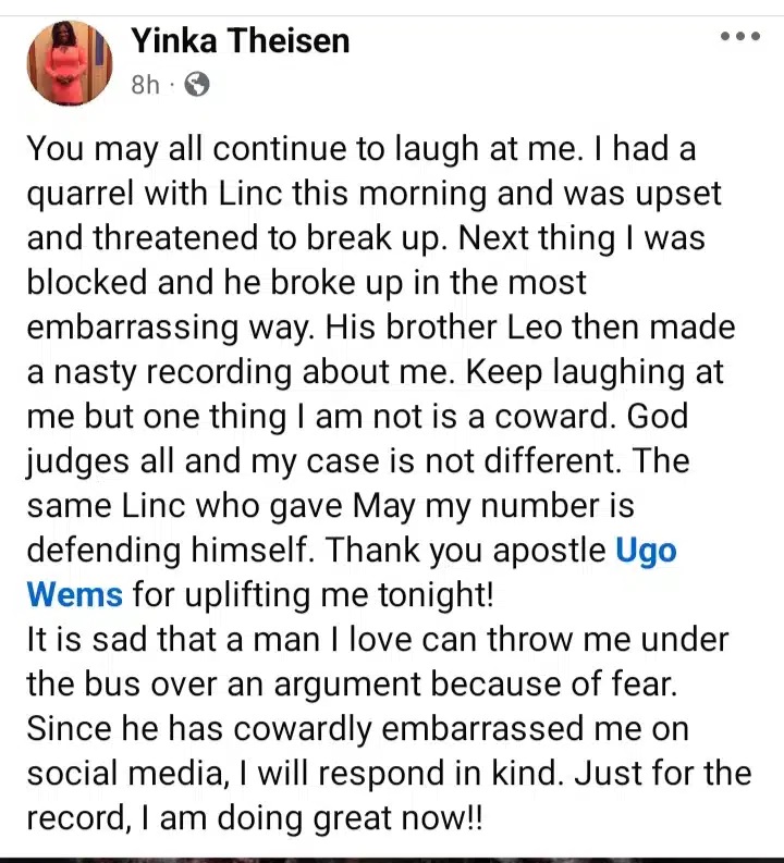 Keep laughing at me but one thing I am not is a coward. God judges all and my case is not different. The same Linc who gave May my number is defending himself. Thank you apostle Ugo Wems for uplifting me tonight!